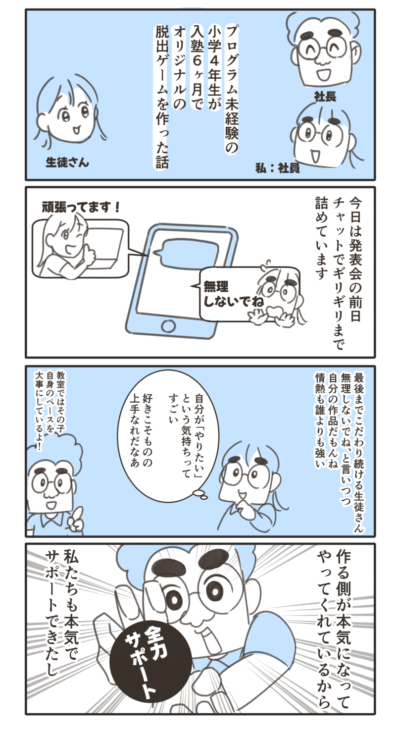 プログラミング教室第1期生が 約6ヶ月間の初級コースを終え、最終的にはオリジナルの「脱出ゲーム」を作り、プレゼンテーションを行うまでの過程を描いた新シリーズマンガ📕✨の第8話を更新しました!